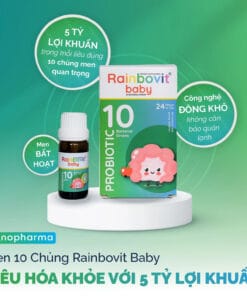 Rainbovit baby Probiotic là thực phẩm chức năng chứa hỗn hợp đông khô của 10 chủng vi khuẩn như Lactobacillus acidophilus, Lactobacillus casei, Lactobacillus rhamnisus, Bifidobacterium breve, Lactobacillus plantarum,…. giúp bổ sung men vi sinh cho hệ tiêu hóa và tăng cường sức đề kháng cho cơ thể.