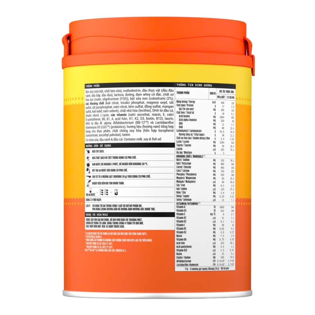 Bột sữa (sữa bột, chất béo sữa), maltodextrin, lactoza, dầu thực vật (dầu đậu nành, dầu dừa, dầu hướng dương giàu oleic),đạm whey cô đặc, các khoáng chất (tricalci phosphat, kali citrat, kali clorid, natri citrat, calci carbonat, magnesi oxyd, sắt sulfat, kẽm sulfat, đồng sulfat, mangan sulfat, kali iodid, natri selenit), chất xơ hòa tan oligofructose (FOS), bột sữa non (colostrum) (I %), chất nhũ hóa (lecithin), DHA từ dầu cá, natri caseinat, ARA từ dầu M. alpina, cholin clorid, cåc vitamin (natri ascorbat,E, niacin, calci D-pantothenat, Bl, B2, A, B6, acid folic, K1, biotin, D3, B 12), taurin,