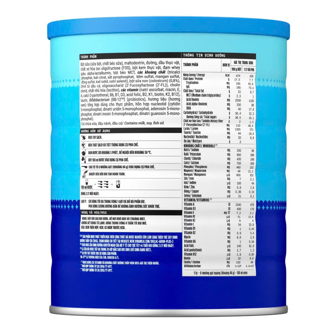Bột sữa (sữa bột, chất béo sữa), maltodextrin, đường, bột béo MCT, dầu thực vật, đạm whey giàu alpha-lactalbumin, bột kem thực vật, chất xơ hòa tan oligofructose (FOS), bột sữa non (colostrum) (0,8%), các khoáng chất (tricalci phosphat, kali citrat, sắt pyrophosphat, kẽm sulfat, mangan sulfat, đồng sulfat, kali iodid, natri selenit), DHA từ dầu cá, oligosaccharid (2’-Fucosyllactose (2’-FL)), chất nhũ hóa (lecithin), cholin clorid, các vitamin (natri ascorbat, niacin, E, A, calci D-pantothenat, B6, B1, D3, acid folic, B2, K1, K2, biotin, B12), ARA từ dầu M. alpina, taurin, Bifidobacterium (BB-12™) (probiotics), hương liệu (hương vani) tổng hợp dùng cho thực phẩm, hỗn hợp nucleotid (cytidin 5-monophosphat, dinatri uridin 5- monophosphat, adenosin 5-monophosphat, dinatri inosin 5-monophosphat, dinatri guanosin 5-monophosphat).