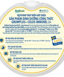 Nutifood Sweden GrowPLUS+ Sữa non Immunel với công thức đột phá được phát triển bởi Nutifood Thụy Điển, xây dựng nền tảng FDI hỗ trợ đề kháng khỏe, tiêu hóa tốt giúp chuyển hóa tốt các dưỡng chất. Công thức bộ ba dưỡng chất bảo vệ với Immunel từ Mỹ, kết hợp 100% sữa non 24h chứa kháng thể IgG và 2’-FL HMO, hỗ trợ tăng cường đề kháng, cho bé khỏe mạnh. Sữa Grow Plus Colos Immunel Nutifood hương vị thơm ngon, dễ uống tối ưu cho thể trạng và nhu cầu dinh dưỡng đặc thù của trẻ em Việt Nam. Sản phẩm sữa Nutifood Sweden GrowPLUS+ Sữa non Immunel có truy xuất nguồn gốc rõ ràng, đảm bảo tính minh bạch và chất lượng cao của các nguyên vật liệu.