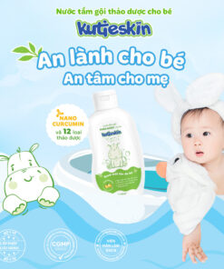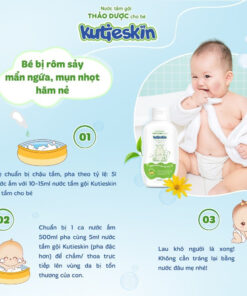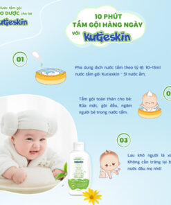 – Bước 2: Nếu bé gặp vấn đề về da (rôm sảy, mẩn ngứa, chàm sữa,…): Truớc khi tắm, chuẩn bị thêm 1 phần dung dịch pha đặc: 500ml nước ấm với 5ml nước tắm gội Kutieskin; thoa trực tiếp lên vùng da bị tổn thương của con khoảng 2-3 phút