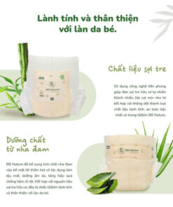 - Bỉm Dán BB Nature NB 60Pcs có thành phần giàu vitamin B1, B2, B6… cùng nhiều dưỡng chất giúp chăm sóc làn da, đặc biệt là da nhạy cảm của trẻ nhỏ. BB Nature đã bổ sung tinh chất nha đam vào bề mặt lõi thấm hút có tác dụng làm dịu mát, dưỡng ẩm da, tăng hiệu quả chống hăm rõ rệt.